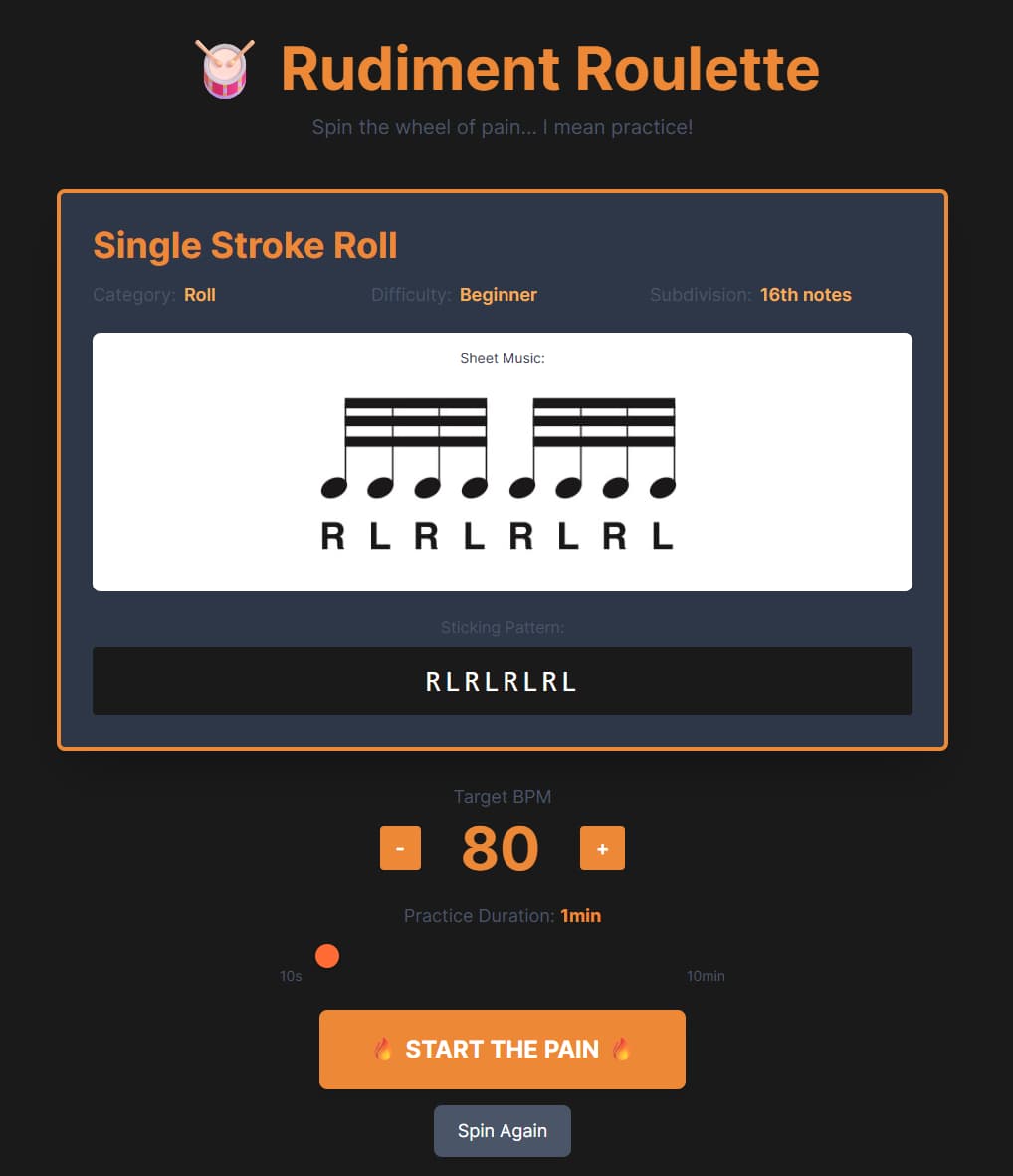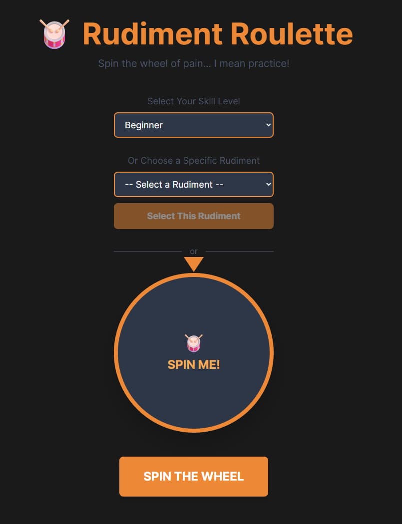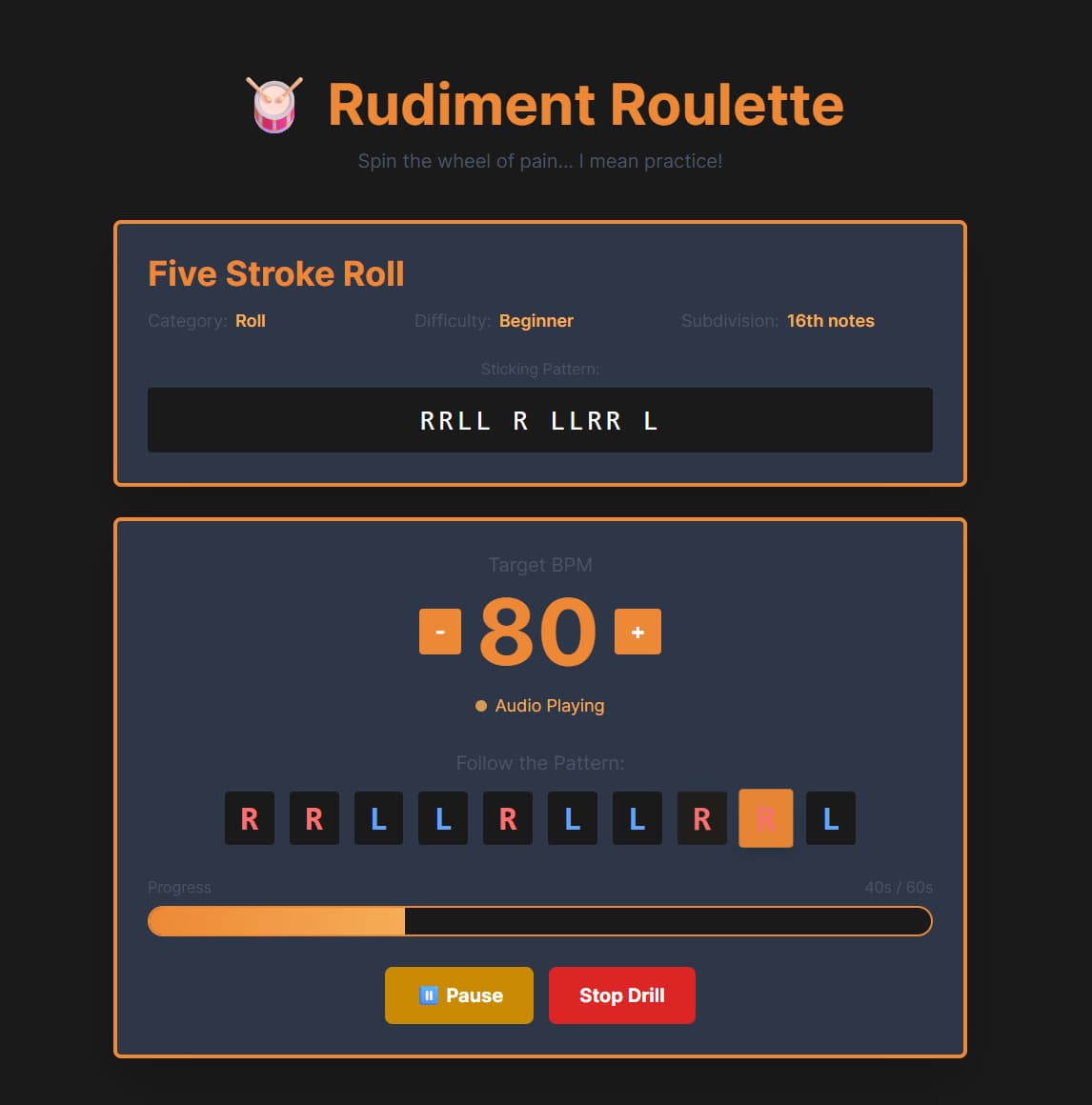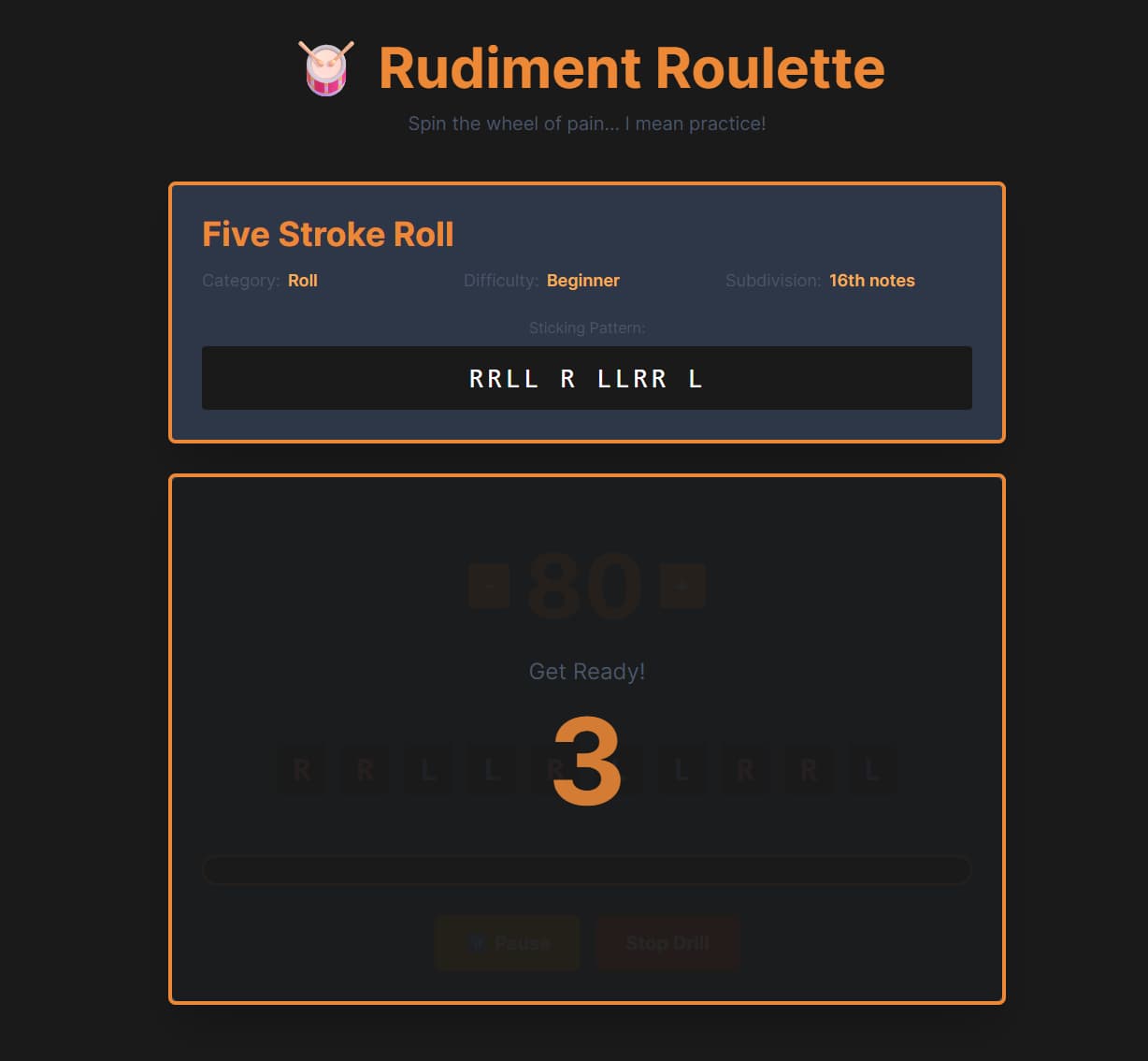Practicing these rudiments can be tedious, which is where Rudiment Roulette comes in. But honestly? I built this as a fun side project to learn Vue 3. As a developer who also plays drums, I wanted to explore Vue's Composition API, TypeScript, and modern web audio capabilities while solving a real problem I faced in my own practice sessions.